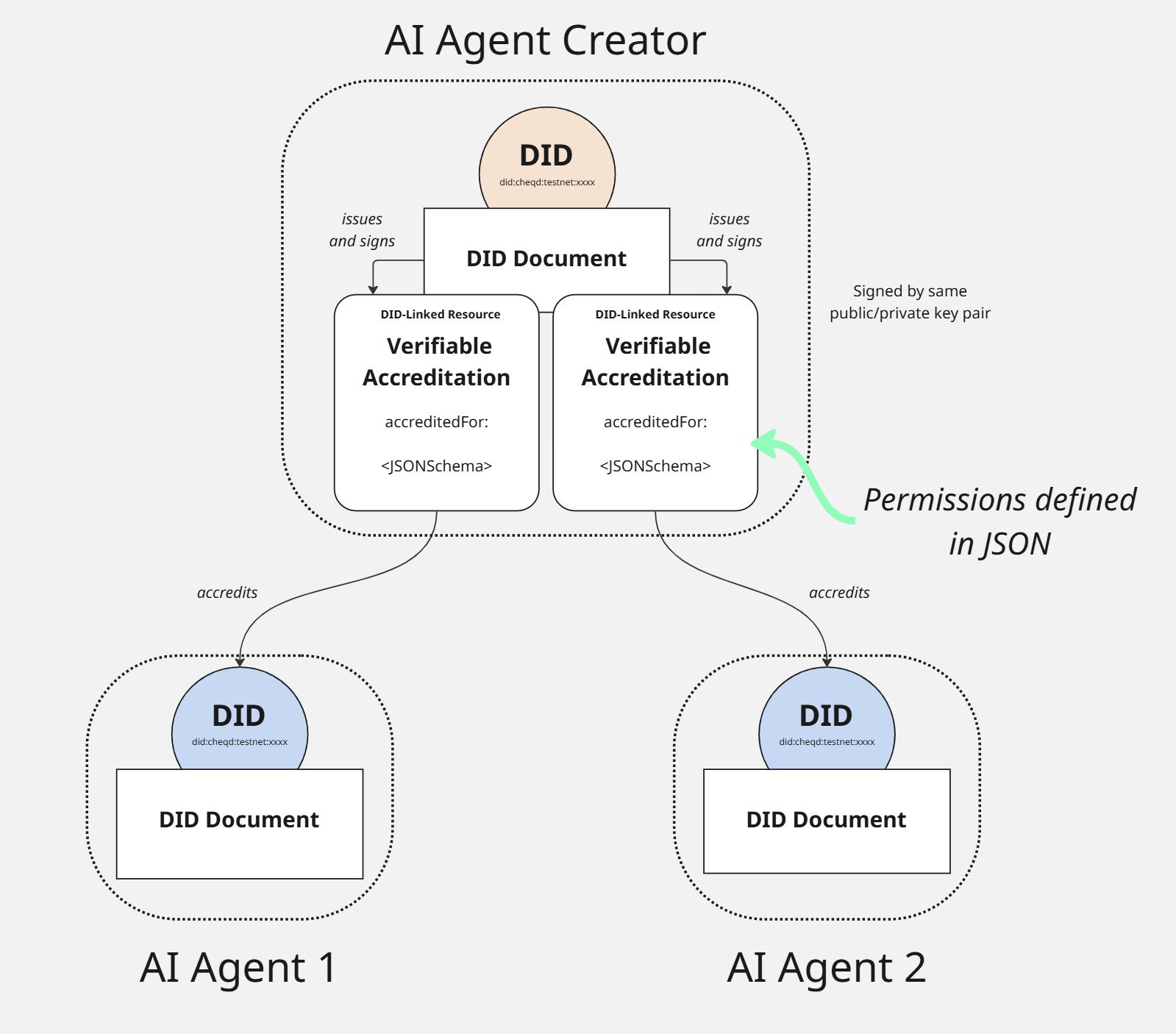 Through this type of relationship, an AI Agent can prove that it is accredited by an AI Agent Creator through presenting the Verifiable Accreditation, which is stored on the cheqd blockchain.