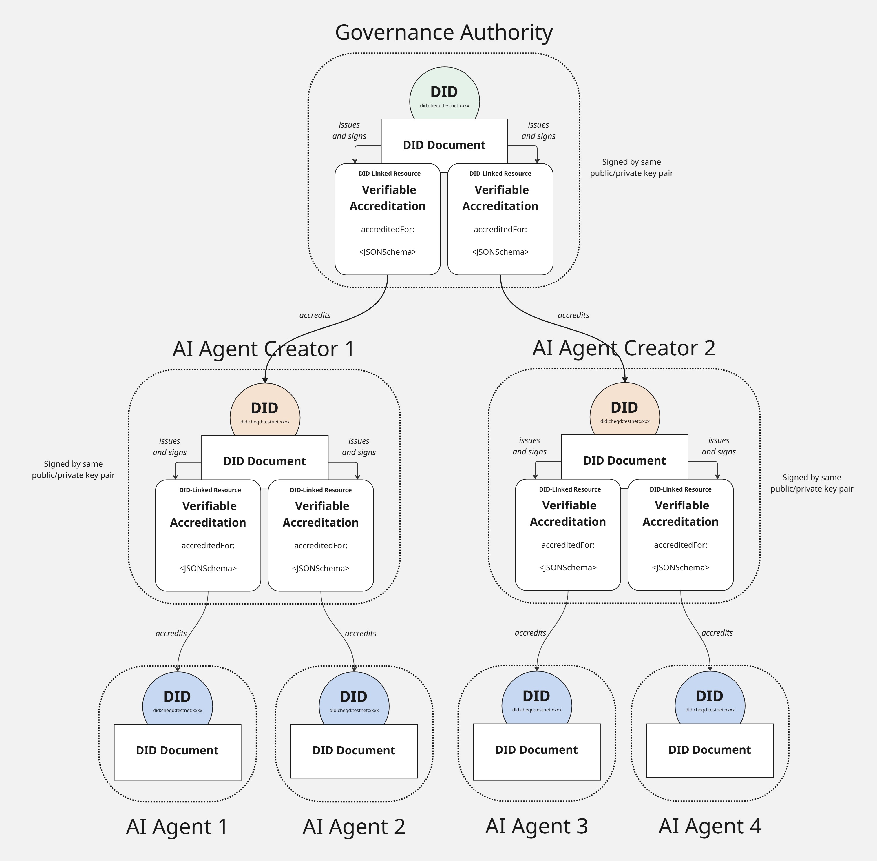 <figure><img src="https://3569764573-files.gitbook.io/~/files/v0/b/gitbook-x-prod.appspot.com/o/spaces%2FPVAMvpKH7PYzvXA6u6Cn%2Fuploads%2Fgit-blob-c40d27b4f707c05e7acbbb31d5e01f4d3718b59e%2FAI%20Agent%20Trust%20Registries%20(Governance%20Authority).jpg?alt=media" alt=""><figcaption><p>Full tree diagram of root DID accrediting DIDs, that accredit AI Agents.</p></figcaption></figure>