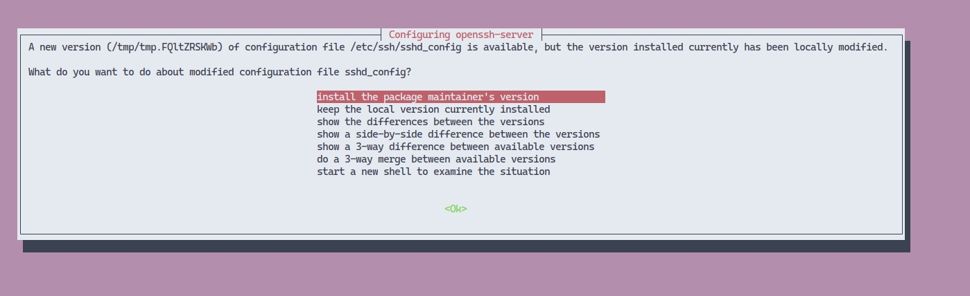 There will be some configuration changes and you'll probably be asked if you want to install a new version of certain software (see the screenshots and examples below). In most cases, it is completely fine to overwrite configuration changes, but be cautious if you have some custom configurations, since these actions will overwrite them: