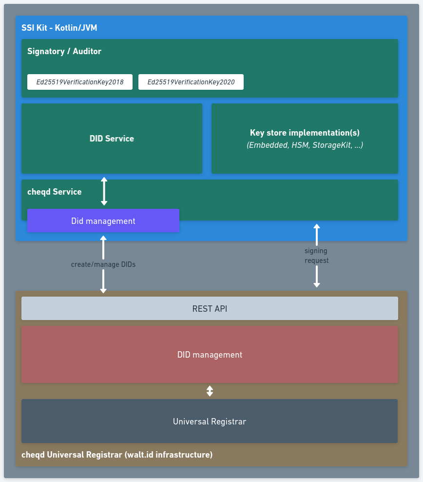 In order to be able to onboard the `did:cheqd` on testnet and mainnet, Community Stack relies on a [cheqd universal registrar](https://github.com/cheqd/did-registrar) deployed on walt.id infrastructure. The DID will be created using a key imported into or also created with Community Stack.
